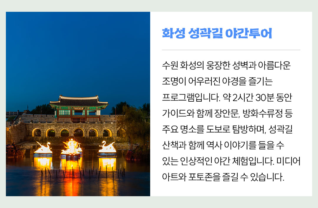 [2026] 5/27(수) [테마여행·역사&문화] 정조와 함께 걷는 수원 화성 역사여행 & 성곽길 야경투어 (노쇼핑 · 노옵션 · 노팁)